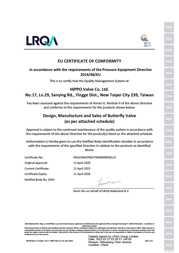 HIPPO Valve perfectly meets the safety requirement of Annex III, Module H of the Pressure Equipment Directive 2014/68/EU, and Schedule 4, Module H of the Pressure Equipment Regulations. This certification guarantee HIPPO's total product life cycle is strictly controlled with:
